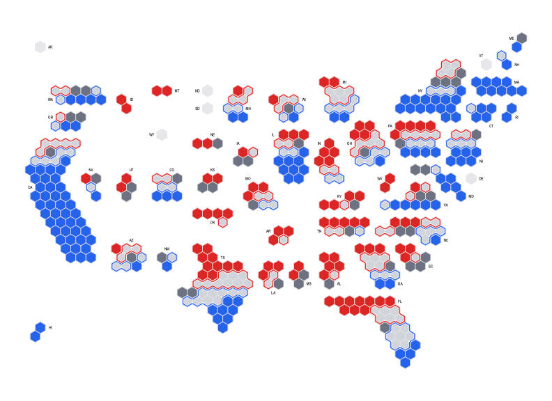 In our article, we show that DCP works using mathematical models and computer simulations. Using the 2020 presidential election results for every state, we ran thousands of simulations producing maps using DCP and “unilateral redistricting” where a single party controls the process. We then compared the results across four outcomes: Democrats redistricting unilaterally, Republicans redistricting unilaterally, DCP where Democrats define and Republicans combine, and DCP where Republicans define and Democrats combine. We find that DCP substantially reduces bias in favor of either party compared to unilateral redistricting.The figure below shows our results The hexagons filled in solid red represent seats always won by Republicans, and those in blue always won by Democrats. Under DCP, the gray hexagons outlined in blue and red would be those won by Democrats and Republicans, respectively. The remaining two seats would be won by the defining party.For example, in Texas, Republicans could draw a map with 8 Democratic seats and 30 Republican seats; Democrats could draw a map with 28 Democratic seats and 10 Republican seats. In theory, the control of 20 seats swings between the parties based on who draws the map. Under DCP, Democrats would win 17 seats, and Republican would win 19 seats, with two seats up-for-grabs depending on which party is the definer and combiner. Using DCP, instead of unilateral redistricting, reduces the number of seats up-for-grabs by controlling redistricting by 90%, and yields a much more representative map.